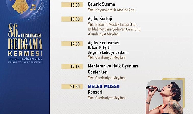 Türkiye’nin ilk yerel festivali olma özelliği taşıyan, Gazi Mustafa Kemal Atatürk’ün öngörüsü ile 1937 yılından beri 86 yıldır kesintisiz olarak düzenlenen Uluslararası Bergama Kermesi 20-26 Haziran tarihlerinde zengin içeriği ile başlıyor. Son yılların en görkemli, İzmir'in en zengin içerikli festivali için nefesler tutuldu, Pazartesi saat 18.00'de kortej yürüyüşü ve Cumhuriyet Meydanı'ndaki açılış töreni için son hazırlıklar gözden geçirilmeye devam ediyor. #UNESCO Dünya Mirası Bergama; konser, tiyatro, söyleşi, panel, yerli yabancı halkoyunları gösterileri, sportif etkinlikleri ve hediyelik birçok ürünün yer aldığı standları ile konuklarını beklemeye başladı. FESTİVAL MELEK MOSSO KONSERİ İLE BAŞLAYIP, SERTAP ERENER KONSERİ İLE SON BULACAK. Etkinliklerin 7 gün süreyle devam edeceği festival, 20 Haziran 2022 tarihinde başlayacak. Kermes sanatçılar geçidinde; Bergama'nın yetiştirdiği dünyaca ünlü klarnet virtüözü Hüsnü Şenlendirici, Sertap Erener, Melek Mosso, Kubat, Tuğba Yurt, Öykü Gürman, Ahmet Şafak, Mustafa Cihat Kılıç Bergama’da sahne alacak. Ünlü Tarihçi Prof. Dr. İlber Ortaylı’nın panelist olarak katılacağı kermes programında tiyatro gösterisi, yerli ve yabancı halk dansları toplulukları yer alacak.