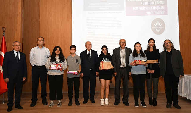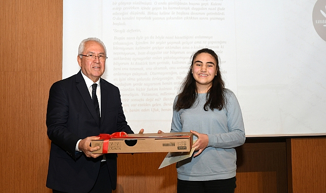 Karabağlar Belediyesi’nin 10 Kasım Atatürk’ü Anma Günü ve Atatürk Haftası kapsamında düzenlediği “Atatürk’ten Mektup Var” konulu kompozisyon yarışmasında dereceye giren öğrencilere ödülleri törenle verildi. Yıldız Kenter Kültür ve Sanat Merkezi’nde gerçekleştirilen törene, Karabağlar Belediye Başkanı Muhittin Selvitopu, meclis üyeleri, Belediye Başkan Yardımcısı Y. Güven Güngörmüş, Seçici Kurul üyeleri, öğretmenler, öğrenciler ve aileleri katıldı.