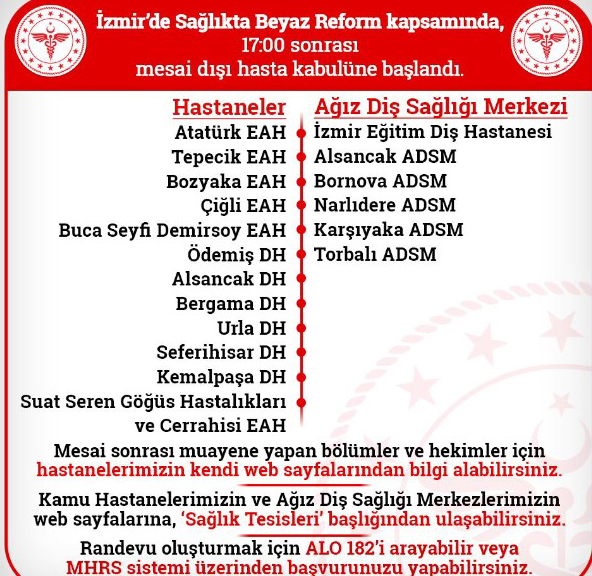 İzmir’de “Beyaz Reform” kapsamında hasta kabulü yapacak hastanelerin listesi Sağlık Bakanlığı’nın resmi sitesinde yayınlandı. İşte o hastaneler: