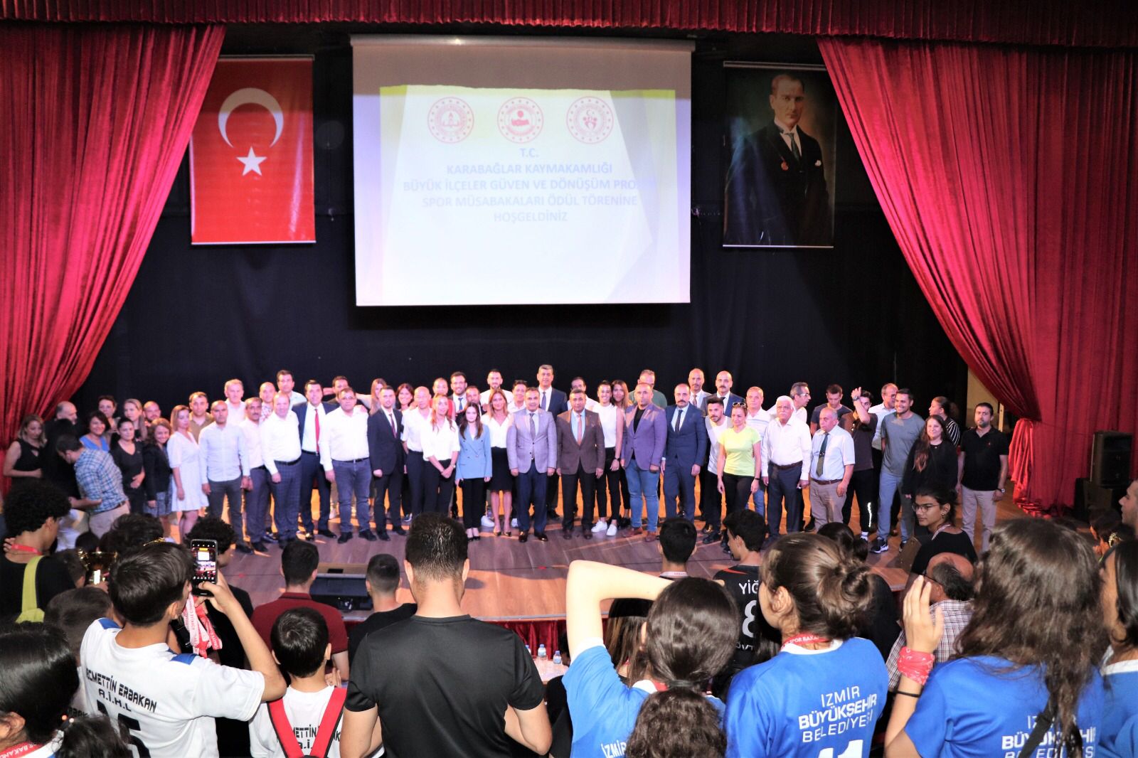 İçişleri Bakanlığı Büyük İlçeler Güven ve Dönüşüm Projesi çerçevesinde faaliyetleri yürütülen projede, 9 branş ve 21 kategoride ortaokul ve lise düzeylerinde gerçekleştirilen spor müsabakalarındaki ödüller törenle sahiplerine ulaştı. 1704 gencin ter döktüğü müsabakalar sonucu elde edilen 640 madalya ve kupanın takdiminin yapıldığı törende konuşan Karabağlar Kaymakamı Cemil Özgür Öneği, “Sağlıklı ve huzurlu bir toplumun temeli olan sporun kalıcı bir kültür haline gelebilmesi için her bir kurumumuzla iş birliği içerisinde, gençlerimiz için imkanları çoğaltma gayretindeyiz.” şeklinde konuştu.