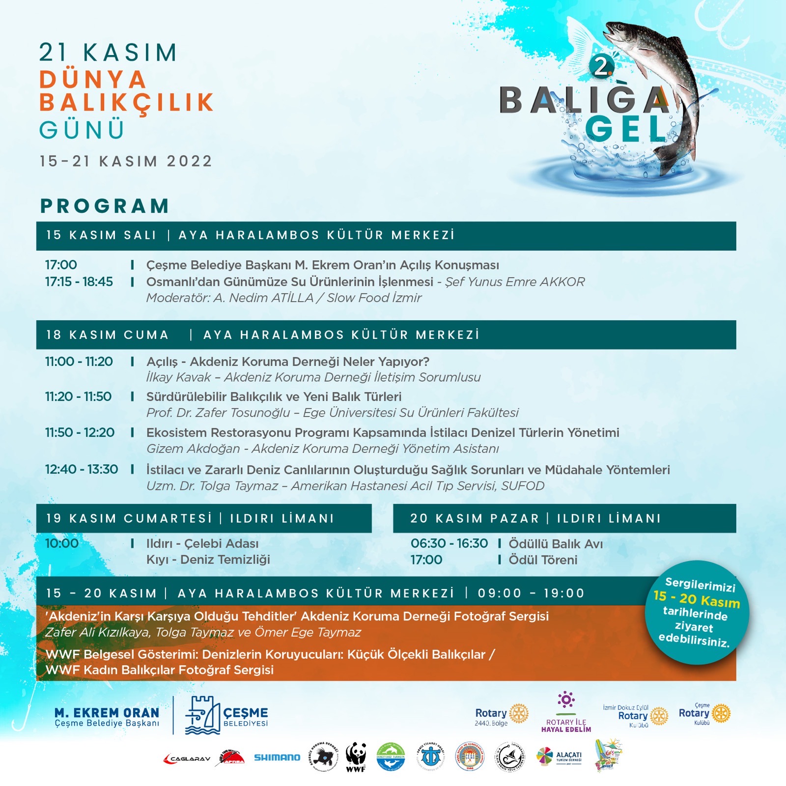 Çeşme Belediyesi ev sahipliğinde Dokuz Eylül Rotary Kulübü, bu yıl Dünya Su Ürünleri Yetiştiricileri ve Balıkçılar Forumu’nun 1997’de Yeni Delhi’de aldığı bir kararla her yıl 21 Kasım’da kutlanan Dünya Balıkçılık Günü’nü, Çeşme’de düzenlenecek etkinlikler ile kutlayacak. “Temiz Su ve Sürdürülebilir Dünya” odak noktası çerçevesinde gerçekleştirilecek olan etkinliklerde denizleri koruma, bilinçli avlanma ve su ürünlerinin işlenmesi konularına dikkat çekilecek. “Deniz kaynaklarımızı korumalıyız”Dünya Balıkçılık Günü’nünde böyle bir organizasyona ev sahipliği yapmaktan mutluluk duyduğunu belirten Çeşme Belediye Başkanı M. Ekrem Oran, “Bir milyardan fazla insanın gıda ihtiyacını ve geçimini sağlayan denizler, soluduğumuz oksijenin de neredeyse yarısını üretiyor. Denizlerimiz bizim yaşam kaynağımız, onları korumak ve deniz kaynaklarını gelecek nesillere aktarabilmek amacıyla bu etkinlikle farkındalık yaratmaya çalışıyoruz” dedi Denizler için farkındalık yaratılacak Çeşme Belediyesi ile birlikte gerçekleştirecekleri kutlamalar ile denizler konusunda farkındalık yaratmak istediklerini belirten Dokuz Eylül Rotary Kulubü Başkanı Nilgün Tiyanşan, konusunda uzman birçok ismin etkinliklerde yer alacağını söyledi. Denizlerin korunmasının dünya üzerinde yaşayan bizler için çok önemli olduğunu vurgulayan Tiyanşan, bu etkinlik ile denizlerin korunması ve bilinçli avlanma ile deniz kaynaklarının gelecek kuşaklara aktarılması konusunda bir sürdürülebilirliğe dikkat çekeceklerini kaydetti. Etkinlik kapsamındaki etkinlikler15-20 Kasım tarihleri arasında Aya Haralambos Kilisesi’nde Akdeniz Koruma Derneği ve WWF’in “Akdeniz'in Karşı Karşıya Olduğu Tehditler” ve «Kadın Balıkçılar» - Fotoğraf Sergisinin yanı sıra derneklerin kısa film gösterimleri 09:00- 19:00 saatleri arasında ziyaretçilere açık olacak. 15 Kasım Salı günü saat 17:00 de Aya Haralambos Kilisesi'nde ünlü şef ve araştırmacı yemek yazarı Yunus Emre Akkor Slow Food İzmir kurucusu A. Nedim Atilla moderatörlüğünde “Osmanlı’dan günümüze su ürünlerinin işlenmesi» konulu sohbet toplantısını gerçekleştirecek. 18 Kasım Cuma günü bu yıl etkinliğin bilimsel destekçisi olan Akdeniz Koruma Derneği önderliğinde 11:00- 14:30 saatleri arasında Aya Haralambos Kilisesinde gerçekleştirilecek olan seminerde Akdeniz Koruma Derneği İletişim Sorumlusu İlkay Kavak “Akdeniz Koruma Derneği Neler Yapıyor?, Ege Üniversitesi Su Ürünleri Fakültesi öğretim üyesi ve Akdeniz Koruma Derneği kurucu başkanı Prof. Dr. Zafer Tosunoğlu “Sürdürülebilir Balıkçılık ve Yeni Balık Türleri”, Akdeniz Koruma Derneği Yönetim Asistanı Gizem Akdoğan “Ekosistem Restorasyonu Programı Kapsamında İstilacı Denizel Türlerin Yönetimi” ve Amerikan Hastanesi Acil Tıp Servisi, SUFOD Uzm. Dr. Tolga Taymaz “İstilacı ve Zararlı Deniz Canlılarının Oluşturduğu Sağlık Sorunları ve Müdahale Yöntemleri” üzerine sunumlarını gerçekleştirecek.