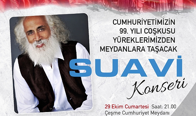 Çeşme Belediyesi’nin Türkiye Cumhuriyeti’nin kuruluşunun 99. yılına özel düzenlediği kutlamalar konserden, Büyük Cumhuriyet Yürüyüşü’ne kadar kentin dört bir yanına sarılacak. Cumhuriyet coşkusu Suavi konseri ile meydanlara taşacak.