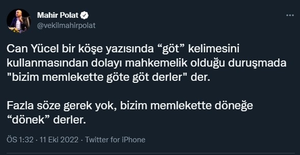 CHP İzmir Milletvekili Mahir Polat, sosyal medya hesabından Çelebi’nin bu kararına karşı Can Yücel’in duruşma çıkışını hatırlatarak tepki gösterdi. Polat’ın o paylaşımı: