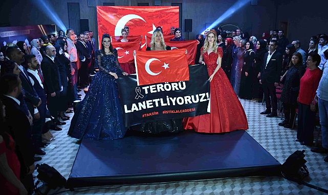 Asr-ı Nazende defilesinde podyuma çıkan Wilma Elles, Tuğba Özay ve Duygu Çakmak, podyumda"Terörü Lanetliyoruz" yazılı pankart açtı...
