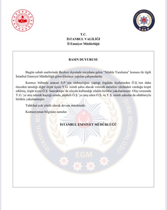 “Kırmızı bültenle aranan S.P.'nin elebaşılığını yaptığı örgütün üyelerinden Ö.Ş.'nin daha önceden tanıdığı diğer örgüt üyesi Y.G. isimli şahsı alacak verecek meselesi yüzünden vurduğu tespit edilmiş, örgüt üyesi Ö.Ş. Sancaktepe'de olayda kullandığı silahla birlikte yakalanmıştır.Olay sırasında Y.G.'ye ateş ederek kaçtığı sırada, şüpheli Ö.Ş.'ye ateş eden O.Ş. ve Y.Ş. isimli şahıslar da silahlarıyla birlikte yakalanmıştır. Tahkikat çok yönlü olarak devam etmektedir.”