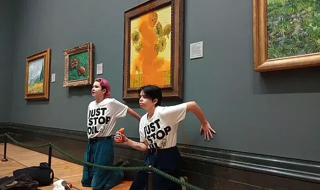 İklim aktivisti olan iki kadın, Londra’da National Gallery’de yer alan Van Gogh’a ait ve değeri yaklaşık 72,5 milyon sterlin değerindeki ‘Ayçiçekleri’ tablosuna iki konserve kutusu domates çorbası fırlattı.'Just Stop Oil' (Sadece Petrolü Durdurun) yazılı tişörtler giyen protestocular, Van Gogh'un adlı tablosuna domates çorbası attıktan sonra yapıştırıcıyla ellerini tablonun altındaki duvara yapıştırdı.21 yaşındaki aktivist Phoebe Plummer, "Daha değerli olan nedir? Sanat mı yoksa hayat mı?" diye bağırdı.Camla kaplı tablonun zarar görmediği ancak çerçevesinde ufak bir hasarın olduğu açıklandı. Polis, tabloya zarar verme girişiminde bulunan iki protestocuyu gözaltına aldı.