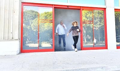 İzmir Büyükşehir Belediyesi İnsan Kaynakları Dairesi Başkanlığı İş Sağlığı ve Güvenliği Şube Müdürlüğü, Kültürpark’taki hizmet birimlerinde yangın tatbikatı düzenledi. Sis makineleriyle yapay duman üretilen binada, sirenlerin çalmasıyla tatbikat başladı.