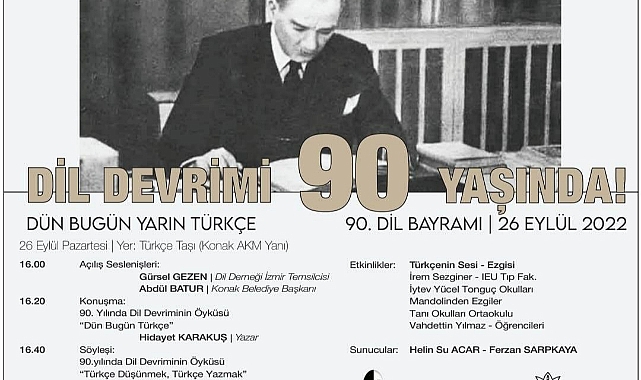 Dil Bayramının 90. Yıldönümü kapsamında kutlama etkinliği 26 Eylül 2022 Pazartesi günü saat 16.00’da Dil Derneği İzmir Temsilciliği ile Konak Belediyesi tarafından Konak’ta
