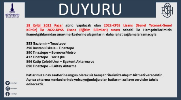 ESHOT Genel Müdürlüğü yarınki otobüs seferlerine ilişkin duyuruda bulundu. Yapılan duyuruda sınav merkezine rahat ulaşım sağlanabilmesi için bazı hatlar sınav saatlerine uygun olarak hizmet vereceği açıklandı. Yapılan açıklamada şöyle denildi:18 Eylül Pazar günü yapılan olan 2022-KPSS Lisans (Genel Yetenek- Genel Kültür) ile 2022- KPSS Lisans (Eğitim Bilimleri) sınavı sebebi ile hemşerilerimizin ikametgahlarından sınav merkezlerine ulaşımlarını daha rahat sağlamaları amacıyla353 Gaziemir-Tınaztepe