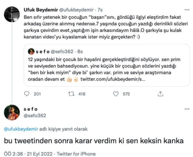 Sefo, Beydemir’in bu eleştirisine sessiz kalmayarak, "12 yaşındaki bir çocuk bir hayalini gerçekleştirdiğini söylüyor. Sen prim ve seviyeden bahsediyorsun. Yine küçük bir çocuğun sözlerini yazdığı 'ben bir kek miyim' diye bir' şarkın var. Prim ve seviye araştırmana oradan devam et" dedi.