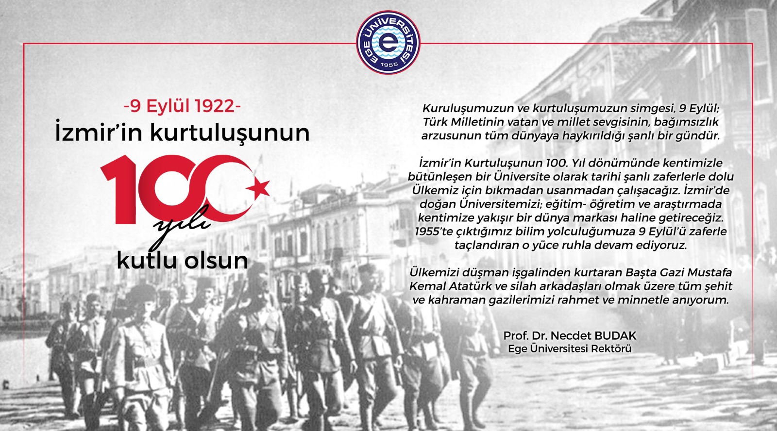 İZMİR (Ege Ajans)- Ege Üniversitesi (EÜ) Rektörü Prof. Dr. Necdet Budak, İzmir’in işgalden kurtuluşunun 100’üncü yıl dönümü dolayısıyla bir kutlama mesajı yayımladı.