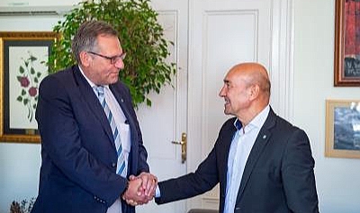 Almanya’nın Bingen am Rhein şehrinin Belediye Başkanı Thomas Feeser, İzmir Büyükşehir Belediye Başkanı Tunç Soyer'i ziyaret ederek Şubat 2023'te Almanya'da yapılacak Dünya Kardeş Şehirler Turizm Birliği buluşmasına konuşmacı olarak davet etti. 91. İEF ve Terra Madre Anadolu İzmir'i de ziyaret etmeyi planlayan Feeser’a Başkan Soyer, İzmir Tarımı'nı ve hedeflerini anlattı.