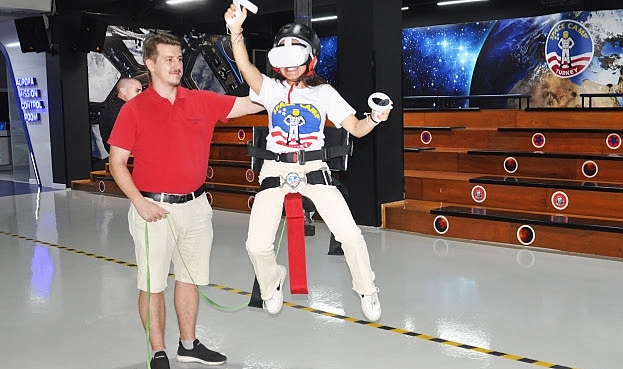 Çocukların Uzay Kampı Türkiyedeki gözde eğitim araçlarından, Ay’da yürüme hissi yaşatan “1/6 Yerçekimi Koltuğu” VR gözlükleriyle güncellendi. Görsel olarak da fiziksel hareketle uyumlu hale getirilerek Ay’daymış hissi yaşatan gözlük ve simülatör ikilisi farklı programlarda kullanılmaya başlandı. NASA’nın Apollo programında görev yapan astronotların Ay’da yürürken neler hissettiğini yaşama imkanı sunan Ay yürüyüşü simülatörü, sanal gerçeklik teknolojisiyle 360 derecelik görüntü imkanı sunan VR gözlükle desteklendi. Bu sayede ünlü astronot Neil Armstrong’un yıllar önce bütün uzay meraklılarını heyecanlandıran Ay’a ayak basarken söyledikleri ile dünyaya aktarılan görüntüler VR gözlükle gerçekmiş gibi yaşatılıyor. Katılımcılar sanal “Ay” yolculukları sırasında, özel kontrol araçlarıyla Ay yüzeyinden taş ve kaya örneklerini de alabiliyorlar.